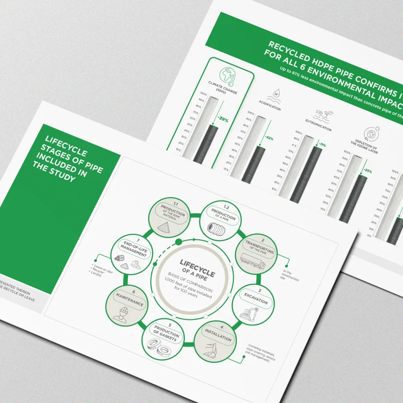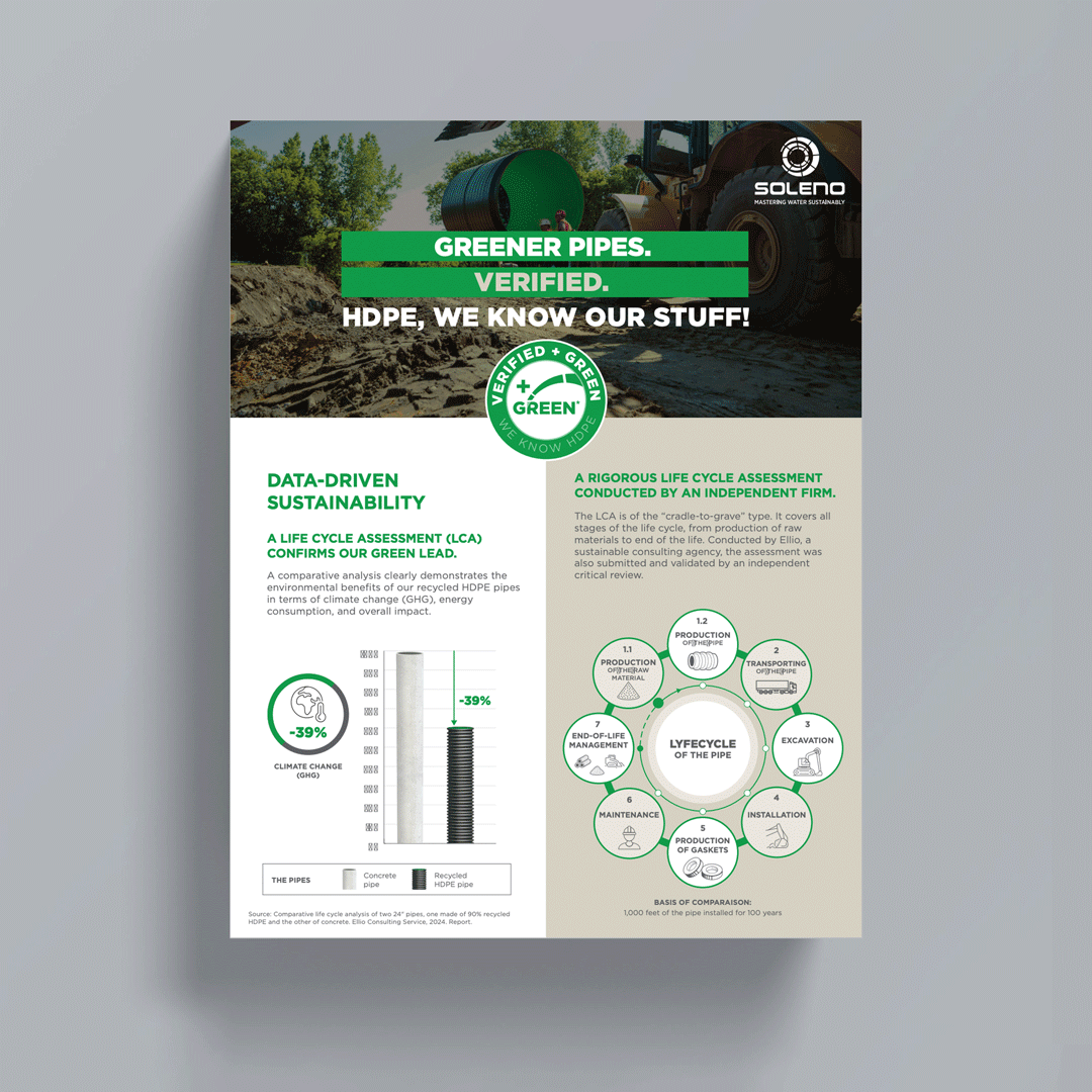 This comparative analysis, carried out by the sustainability consulting firm Ellio using a recognized methodology, confirmed the product’s durability and environmental performance. And the company contributes to a greener world. The proof: a Soleno pipe made of recycled HDPE generates up to 61% less environmental impact than a concrete pipe of the same diameter made in Quebec.